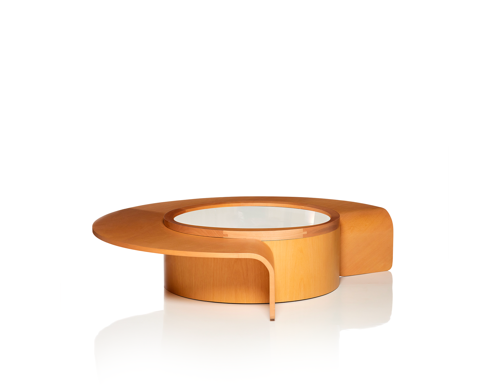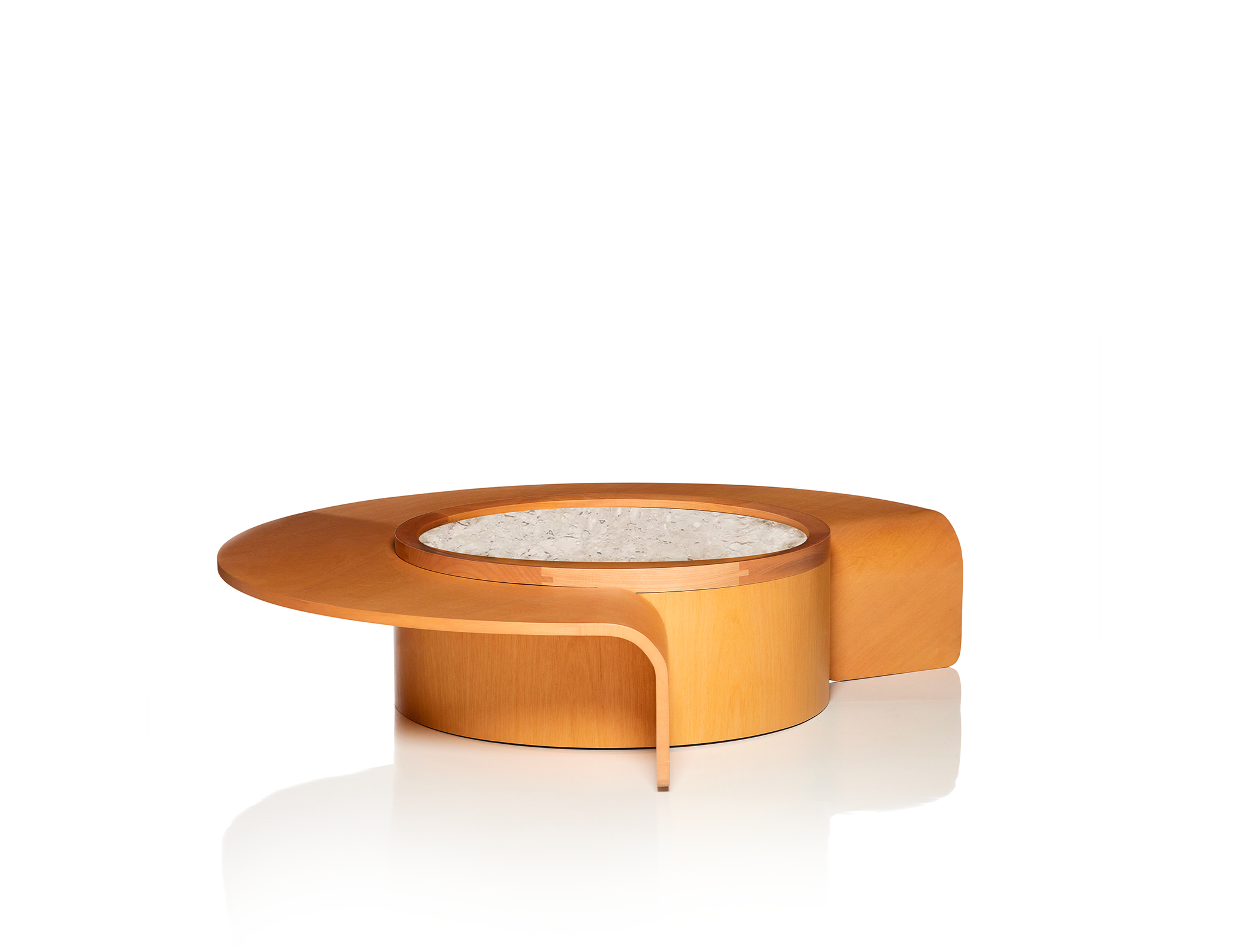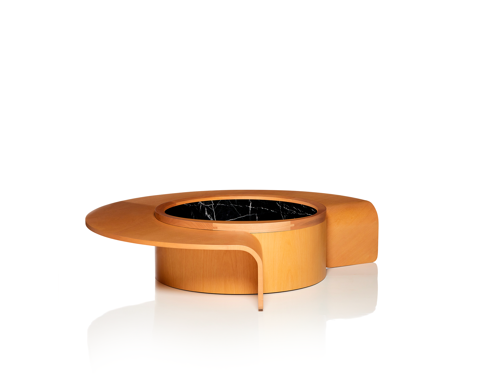 Composta através de uma geometria singular, a mesa de centro Lay retrata a continuidade das formas de modo que o tampo superior entrelaça a peça central. Nesta confluência, as linhas são interrompidas provocativamente, se estendendo até o chão em alusão ao movimento do desenho.